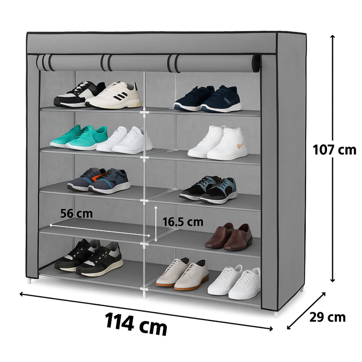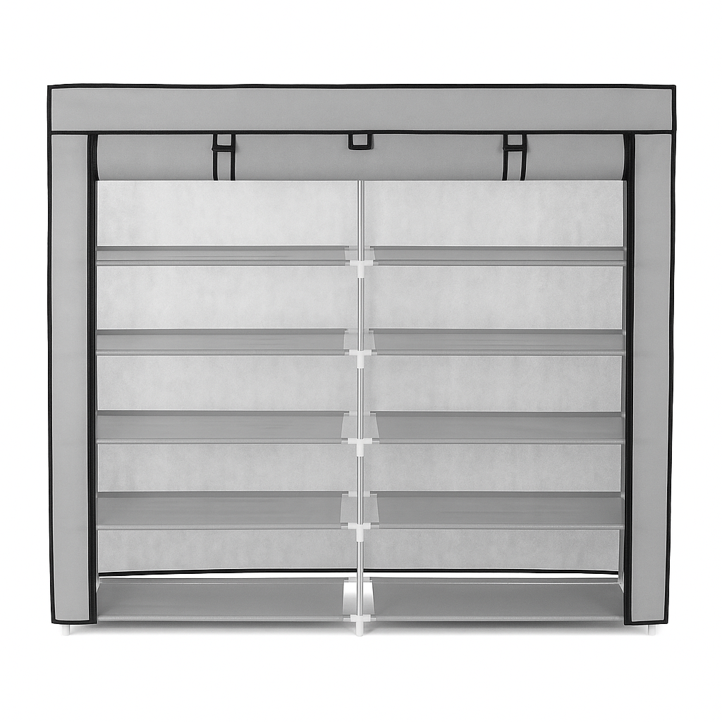 Ta 6-nadstropna garderobna omara iz blaga je popolna rešitev za vse, ki cenijo red in optimizacijo prostora. Zahvaljujoč 12 prostornim policam lahko shranite ne le čevlje, temveč tudi oblačila, dodatke in celo škatle z drobnarijami , zaradi svoje univerzalne zasnove pa se odlično prilega različnim notranjim prostorom – od predsobe, prek omare do otroške sobe.