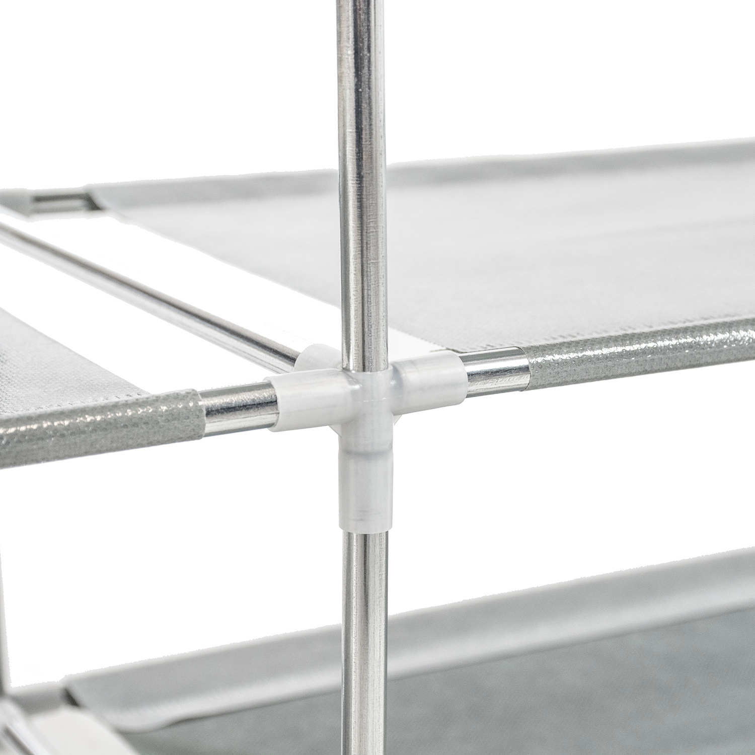 Zahvaljujoč uporabi lahkih materialov, kot so kovinske cevi in police iz netkanega blaga, je premikanje omarice izjemno enostavno.