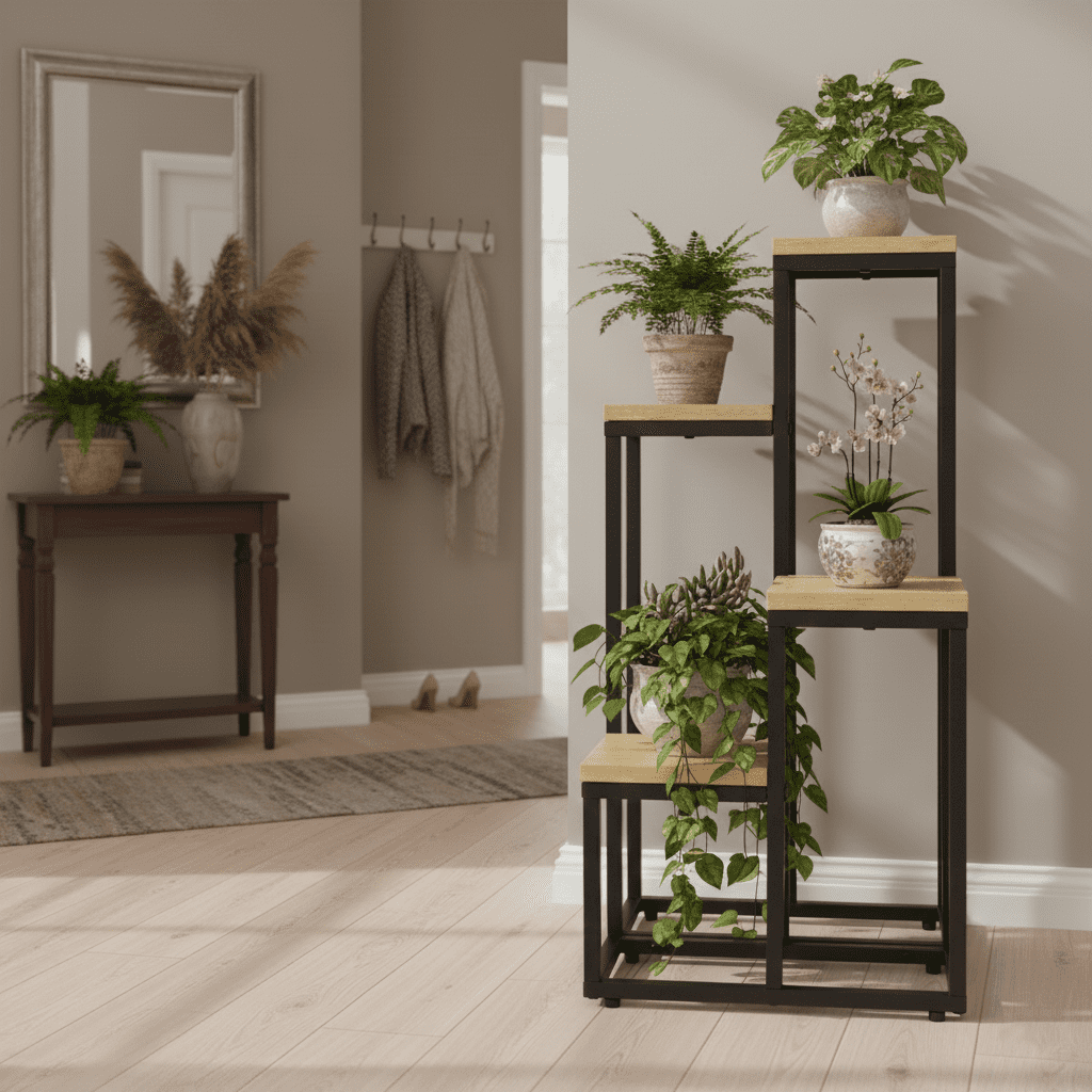 ✨ Zahvaljujoč kovinski konstrukciji in policam iz pohištvene plošče je stojalo za rože stabilno, trpežno in se prilega sodobnim aranžmajem.
