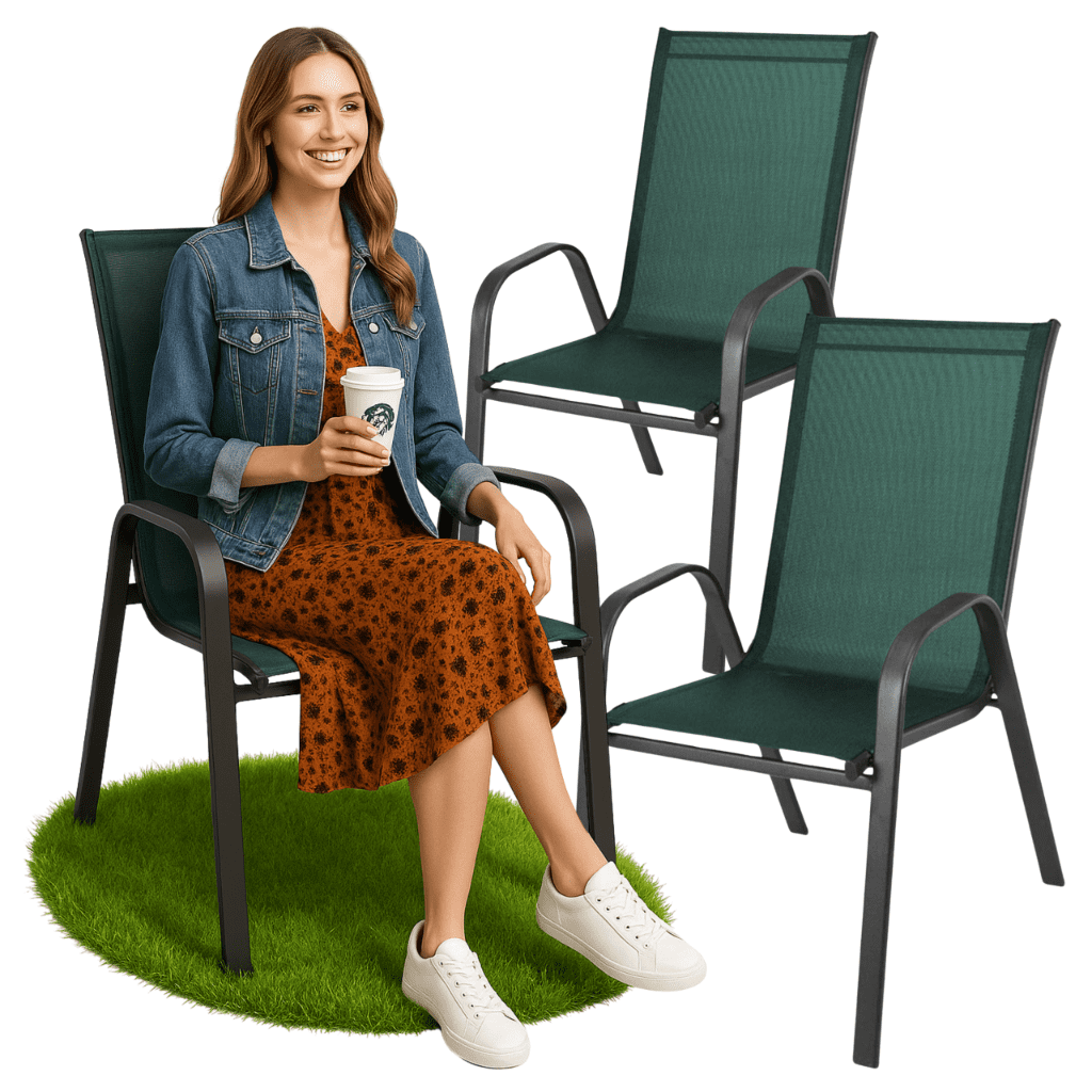 Udoben stol, popoln za vaš vrt. Okvir je dvojno prašno barvan, zaradi česar je ta izdelek idealen tako za notranjo kot zunanjo uporabo. Sedež in naslonjalo sta izdelana iz zelenega, prožnega tekstilnega oblazinjenja za maksimalno udobje. Ima dva naslona za roke. Noge so dodatno opremljene s plastičnimi pokrovčki.