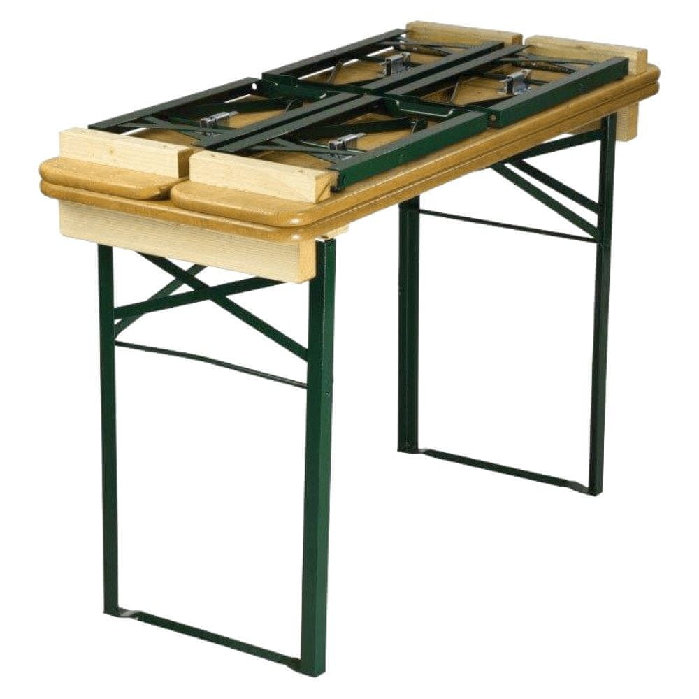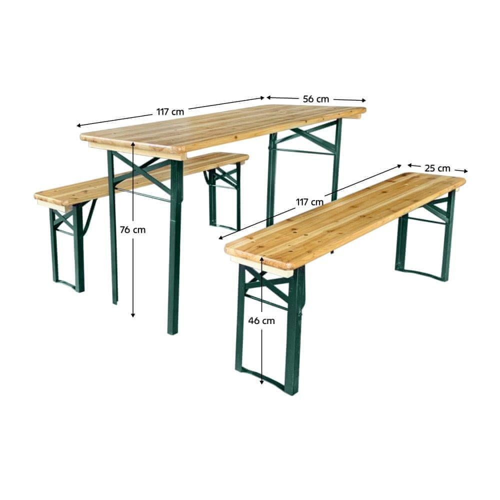 Uživajte v udobnem posedanju s pivskim setom GANSO TYP 2 1+2, ki je idealen za vrtove, terase, praznovanja ali festivale. Ta tridelni set je sestavljen iz ene mize z dimenzijami (ŠxGxV): 117×56×76 cm in dveh klopi velikosti (ŠxGxV): 117×25×46 cm, tako da brez težav zagotavlja prostor za več oseb. Konstrukcija je izdelana iz trpežne kovine v temno zeleni barvi, ki v kombinaciji z masivnim borovim lesom (debelina plošč 2,7 cm) zagotavlja stabilnost in dolgo življenjsko dobo. Les je tlačno impregniran in lakiran, kar ga ščiti pred zunanjimi vplivi. Zahvaljujoč zložljivemu mehanizmu se celoten set enostavno zloži in shrani – zložena miza ima višino le 6 cm. Dimenzije mize po zlaganju so (ŠxGxV): 117×56×6 cm, dimenzije klopi po zlaganju pa (ŠxGxV): 117×25×6 cm. Praktična rešitev za enostaven transport in shranjevanje. Set je hkrati čvrst in zanesljiv – miza prenese do 50 kg, vsaka klop pa do 150 kg, zaradi česar je odlična izbira za vsakodnevno in občasno uporabo na prostem.