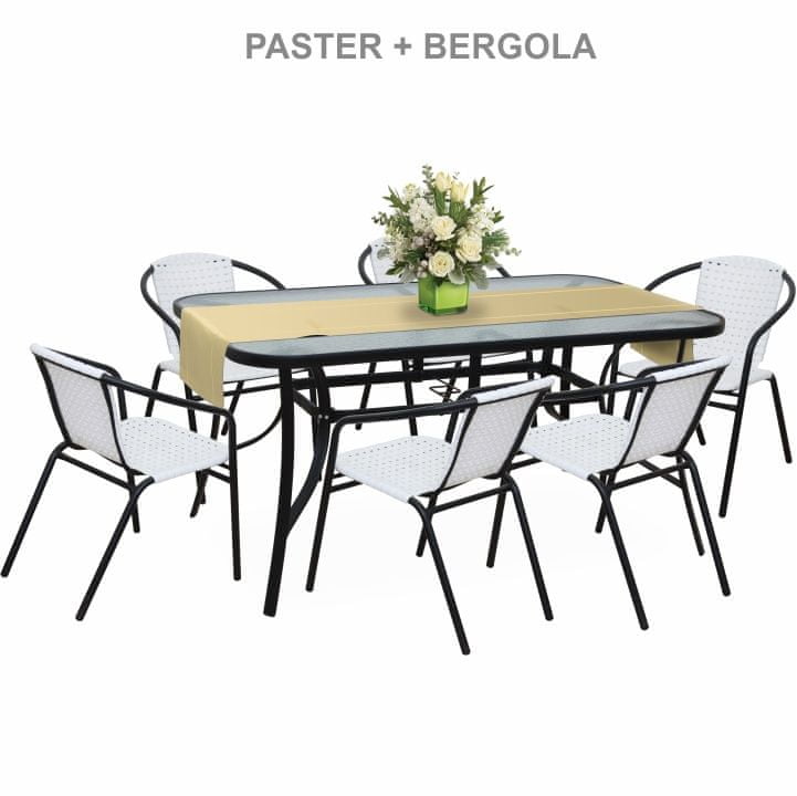 Jedilna miza PASTER je primerna za vrt ali teraso. Njegovo stabilnost zagotavlja trdna jeklena konstrukcija v črni barvi. Zgornja plošča je izdelana iz kaljenega stekla in pripravljena za namestitev senčnika. Uporabljeni material je enostaven za vzdrževanje. Konstrukcija je trdna in zagotavlja stabilnost. Za mizo se lahko udobno namesti do 6 oseb. Priporočamo nakup stolov Aldera za mizo, s katerimi dobite moderen in funkcionalen komplet.