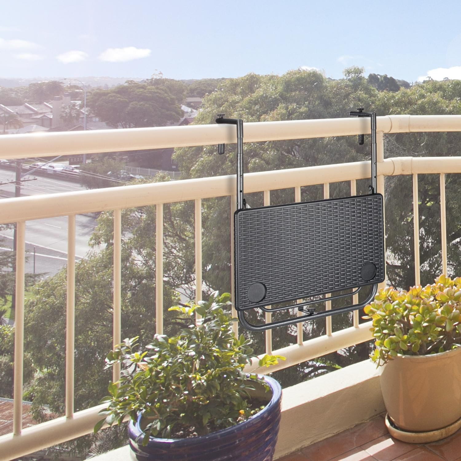 Polepšajte svoj majhen balkon z zložljivo mizo za kavarno, zasnovano za pritrditev na ograjo, ki ponuja nastavljivo višino za vsestransko uporabo. Uživajte v prijetnih trenutkih na prostem s praktičnimi držali za pijačo in prostorom za dva.