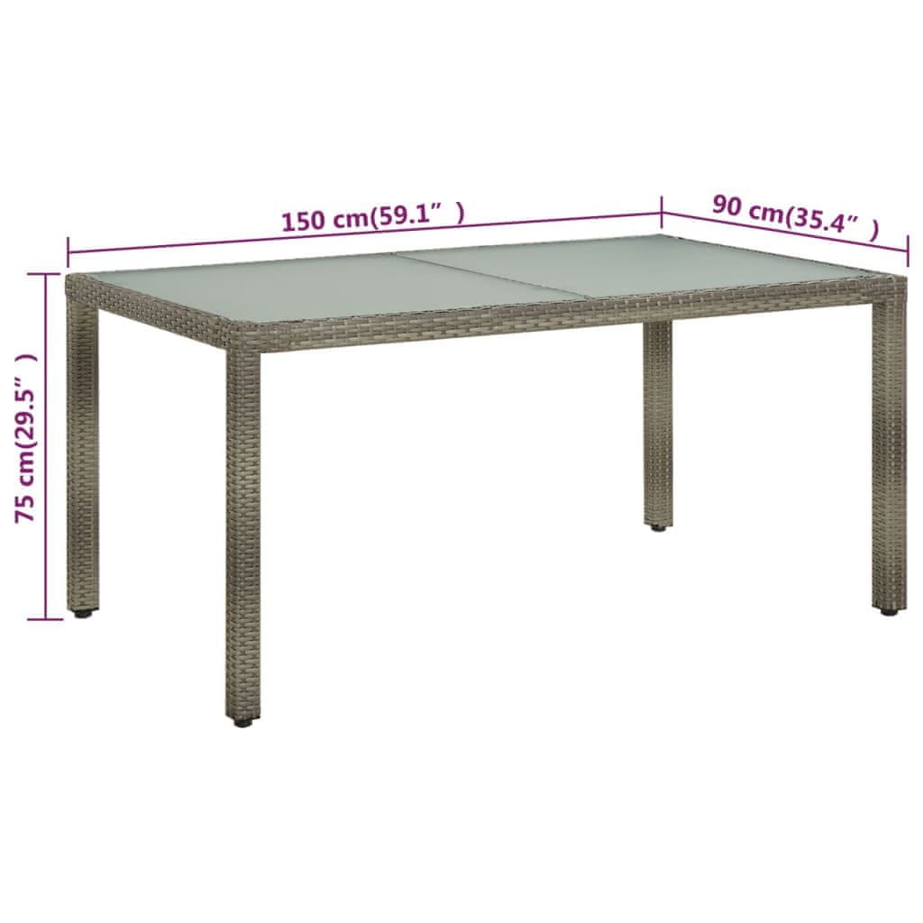 vidaXL Vrtna miza 150×90×75 cm kaljeno steklo in PE ratan siva Celoten opis