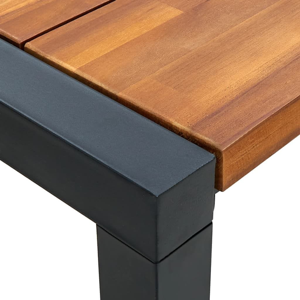 Zunanja jedilna miza ima površino iz trdnega akacijevega lesa z oljnim premazom. To je tropski trdi les, ki je odporen na vremenske vplive in je zelo vzdržljiv. Kovinska konstrukcija s prašnim premazom je odporna na korozijo in rjavenje. Prispeva tudi k industrijskemu videzu mizice.