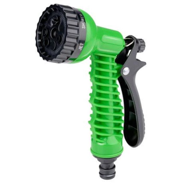Ta komplet gibljive vrtne cevi z nastavkom je idealen za vzdrževanje in zalivanje vašega vrta. Kompletu je priložena gibljiva vrtna cev. Ta ima dolžino 7,5 metra in se lahko podaljša do največ 15 metrov. To vam daje večjo svobodo gibanja kot pri tradicionalni vrtni cevi. To tudi pomeni, da vrtna cev zavzame manj prostora, ko ni v uporabi. Na koncu sta priložena razpršilna glava in spojni del. Pršilna glava ima 7 nastavitev pršenja, od trdega vodnega curka do mehke meglice.
