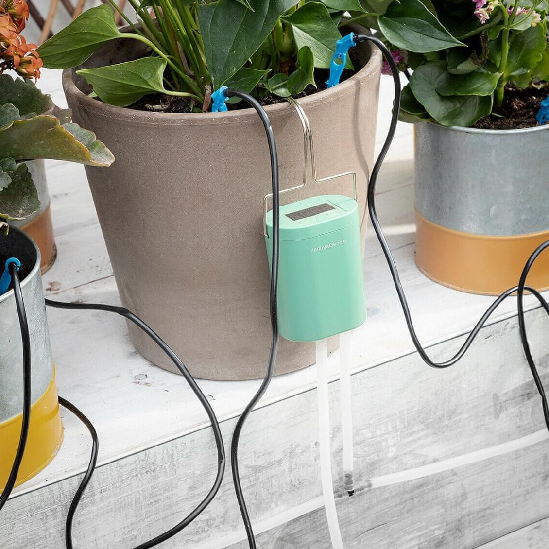 Avtomatski namakalni sistem za lončnice, ki omogoča zalivanje do osmih lončnic hkrati. Namakalni sistem je mogoče polniti (priložen je polnilni kabel USB na mikro-USB) in programirati – digitalni časovnik prikazuje čas med dnevi zalivanja (od 1 do 9 dni). Priloženi so kovinski obešalnik, trojni priključni pribor, cev in cev za vodo ter osem šob za tlačenje zemlje na vsakem lončku. Namakalni sistem ima pretok 1200 ml/min (± 100 ml), delovna temperatura pa je med 5 in 50ºC. Rezervoar za vodo ni priložen.