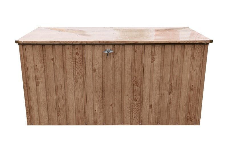 Kovinski zaboj ne potrebuje posebne nege. Njegova površina je zaščitena z vročim cinkanjem in prašnim barvanjem, kar zagotavlja zaboju Duramax dolgo življenjsko dobo. Proizvajalec celo zagotavlja 15-letno garancijo proti rjavenju materiala. Zahvaljujoč dekorju, ki posnema hrastov les, se škatla popolnoma zlije z vašim vrtom.
