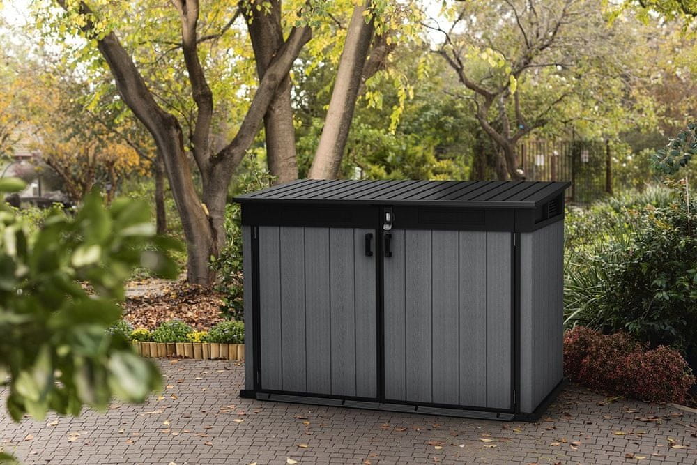 Prostorna omara CORTINA MEGA je dovolj velika, da vanjo shranite številna orodja in pripomočke, ki so potrebni za delo ne le na vrtu. V notranjosti lahko preprosto shranite tudi: žar, blazine, zalivalke, cvetlične lončke, igrače in številne druge predmete. Idealna izbira za shranjevanje košev za smeti. Omara lahko sprejme tri koše za smeti s prostornino 240 l, paket pa vključuje verige, ki omogočajo, da se pokrovi košev za smeti odprejo skupaj s pokrovom omare. Vgrajeno je tudi prezračevanje, ki preprečuje neprijetne vonjave. Možnost namestitve polic je še ena velika prednost – police niso vključene v paket, paket vključuje vijake in kavlje za pritrditev polic (priporočamo uporabo na primer lesenih polic). Dostop do omare olajša poševen prag, dvojna vrata in odpiralni pokrov. Enostavno odpiranje pokrova zagotavljajo hidravlični bati. Omaro za shranjevanje odlikuje preprosta in elegantna oblika ter površinska struktura, ki spominja na les. Zelo stabilna konstrukcija, ojačane stene in možnost zaklepanja dvokrilnih vrat s ključavnico – vse to zagotavlja zaščito shranjenih predmetov. Omara CORTINA MEGA je odporna na neugodne vremenske razmere. Visokokakovostni plastični materiali EVOTECH zagotavljajo dolgoletno življenjsko dobo izdelka. Omarica ne potrebuje vzdrževanja, ne rjavi in se ne lušči. Odlično bo dopolnila in razširila prostor vaše vrtne hišice, na primer hišic iz serije Cortina.