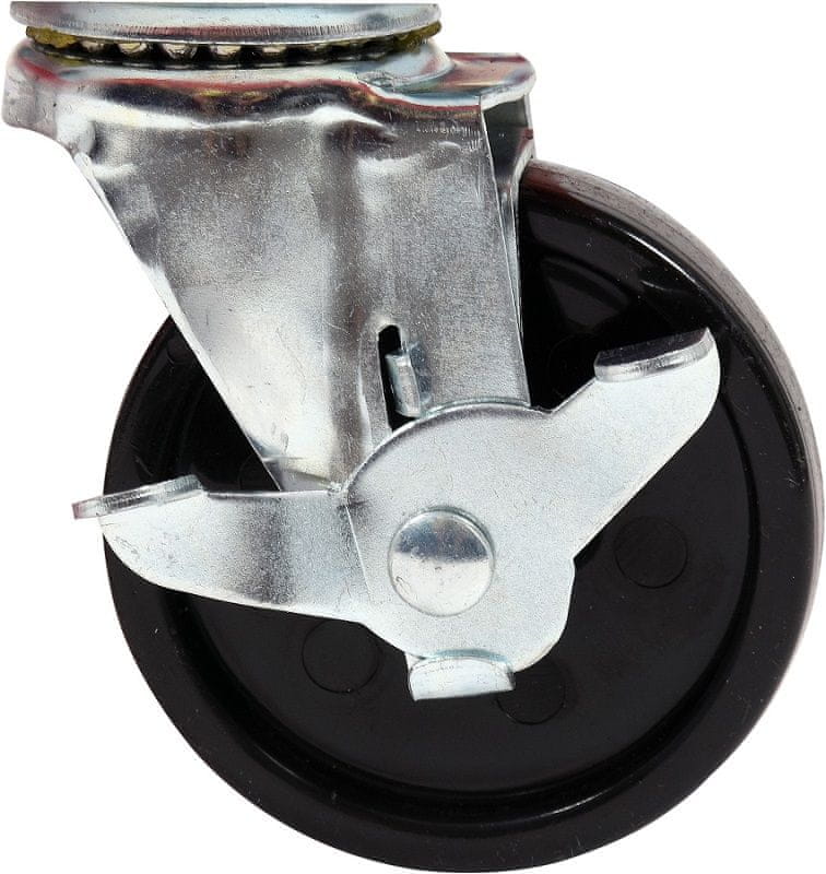 ima 4 kolesa, vključno z 2 vrtljivima kolesoma z zavorami.