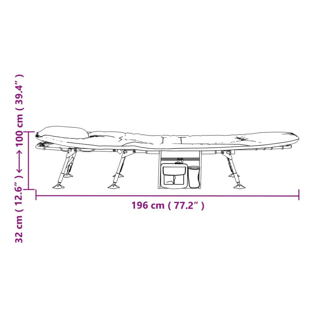 • Praktična oblika: Nastavljive noge ribiške postelje so opremljene z nogami, ki zagotavljajo udobno uporabo tudi na neravnem terenu in preprečujejo, da bi se pogreznile v mehko podlago. Poleg tega ima priročno stransko torbico, ki vam olajša shranjevanje in prenašanje manjših predmetov.