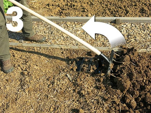 Z ruskimi vilami poteka delo hitro in enostavno. Začnite tako, da orodje prinesete na želeno mesto. Z nogo jih potisnete v tla in jih nato potegnete nazaj, z eno ali obema rokama. Povlecite Ruske vile nazaj po zemlji (ne dvigujte jih iz tal) in postopek ponavljate dokler ne končate z globokim rahljanjem.