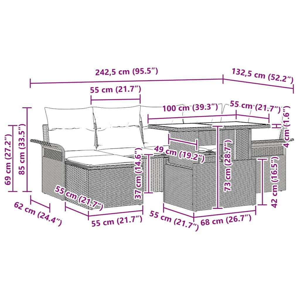 • Odporen poli ratan Glavni material tega seta je poli ratan, znan po svoji trpežnosti in odpornosti na vreme. UV zaščita ohranja obliko in videz, tako da tvoje pohištvo ostane privlačno skozi pomlad in poletje. Ta visokokakovosten material pomembno prispeva k dolgotrajnosti in estetskemu videzu tvojega zunanjega prostora.