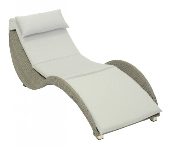Neobrabljen, sodoben in zelo udoben ležalnik Rimini iz ratana v obliki črke S z naslonjali za noge.