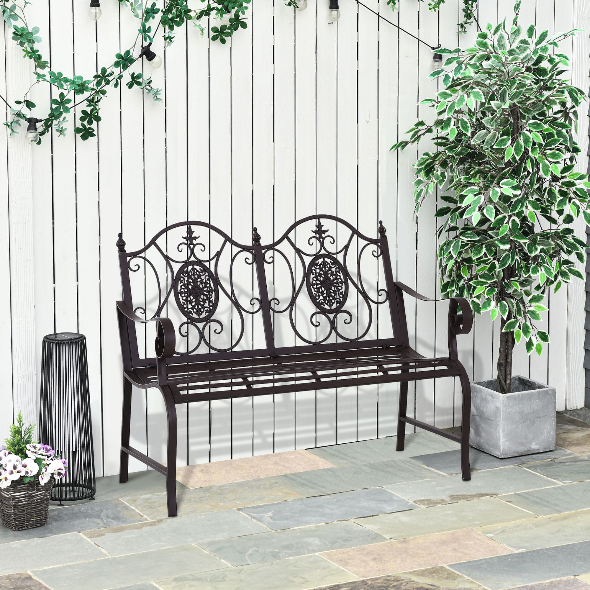 Vrtna klop Outsunny iz trpežne, prašno lakirane kovinske konstrukcije je stabilna in odporna na vremenske vplive za dolgoletno uporabo. S sedežem z letvami in ukrivljenim naslonom za roke, čudovitimi vzorci na naslonu, ki dodajajo slog in eleganco, se zlahka ujema s katerim koli zunanjim prostorom, kot so vrt, dvorišče, terasa, bazen in drugo. Sedeži za 2 osebi za udobno sedenje. Enostavno čiščenje z vlažno krpo. Sedež s kovinskimi letvami je primeren za odvajanje vode v deževnih dneh.Vsebine: