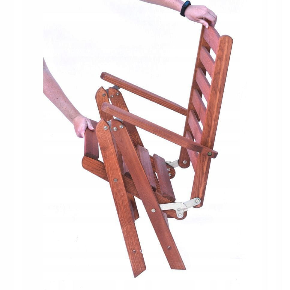 Zložljiv stol je izdelan iz borovega lesa zaščiten z rjavo lazuro, kar zagotavlja stabilnost in vzdržljivost. Stol je zložljiv, zato zavzame malo prostora in je odporen na UV sevanje in spremenljive vremenske razmere. Ima luknje v sedežu, ki preprečujejo, da bi se na njem nabirala voda, kar preprečuje težko odstranljive madeže. Izdelan je iz najkakovostnejših materialov, kar zagotavlja udobno sedenje in možnost uporabe več letnih časov.