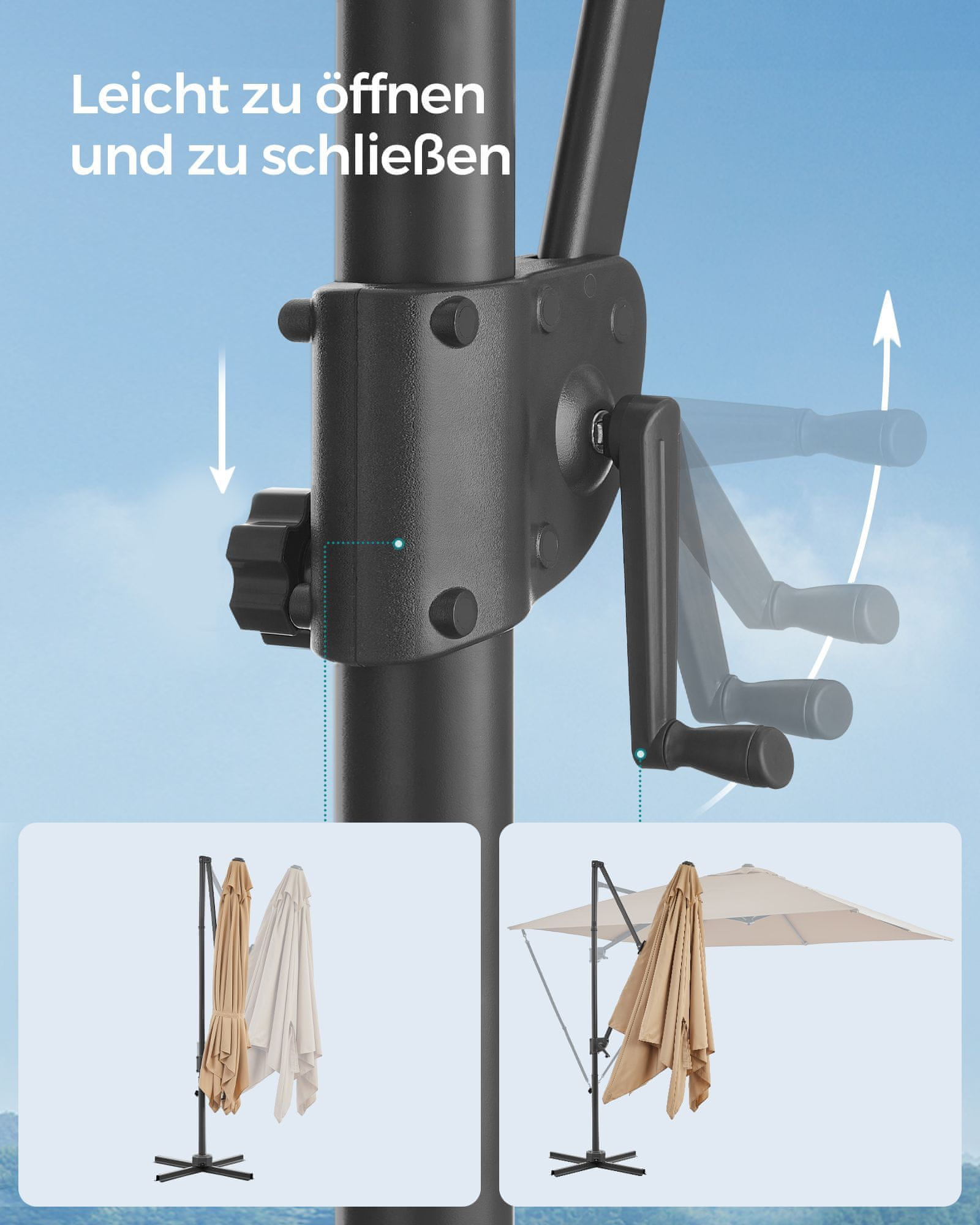 Ta konzolni senčnik je zasnovan za zanesljivo senco in zaščito pred soncem na vašem vrtu terasi ali zunanjem sedežnem prostoru. Njegova nastavljiva nagibna funkcija in 360° rotacija omogočata enostavno prilagajanje sence vašim potrebam čez dan. Trdna konstrukcija in uporabniku prijazen ročni mehanizem ga naredijo praktičen dodatek za vsak zunanji prostor.