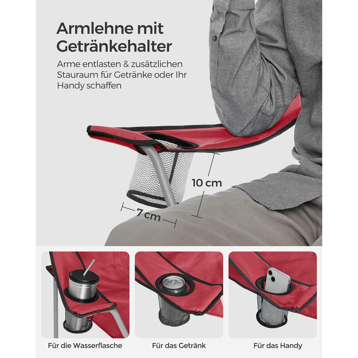 Zložljivi kamp stolčki za zunanjo uporabo ki nudijo udobje in priročnost z naslonjali za roke ter vgrajenim držalom za skodelico. Idealni so za kampiranje piknike ali zunanje dogodke saj zagotavljajo stabilno sedežno rešitev ki je enostavna za prenašanje in postavitev. Stolčki so v kompletu dveh in vključujejo torbe za prenašanje za večjo prenosljivost.