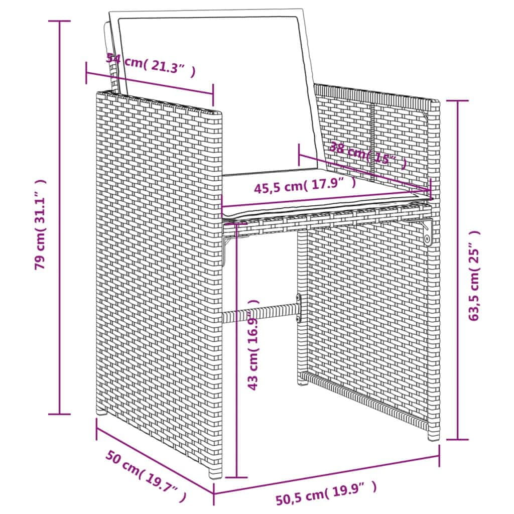 Sprostite se in uživajte na prostem s temi udobnimi vrtnimi stoli! Trpežen material: PE ratan, znan tudi kot poliratan, je trpežen plastični material, ki ne zahteva veliko vzdrževanja in je podoben naravnemu rattanu. Je lahek, enostaven za čiščenje in se zaradi svoje vzdržljivosti ter odpornosti na vremenske vplive pogosto uporablja v zunanjem pohištvu. Udobno sedenje: To vrtno pohištvo z debelo oblazinjenimi blazinami ponuja udobno sedenje. Zložljivo naslonjalo: Ti stoli imajo naslonjalo v obliki zavihka, ki se zloži za prihranek prostora pri shranjevanju. Snemljive in pralne prevleke: Prevleke za blazine je mogoče odstraniti in oprati. Prevleke imajo na hrbtni strani jeziček za enostavno pritrditev na stole. Trden in stabilen okvir: Jeklen okvir s prašnim premazom zagotavlja vzdržljivost in stabilnost za vsakodnevno uporabo na prostem. Dobro je vedeti: Da bi vaše vrtno pohištvo ostalo v dobrem stanju, priporočamo, da ga prekrijete z vodoodporno prevleko. Največ 110 kg na sedež.