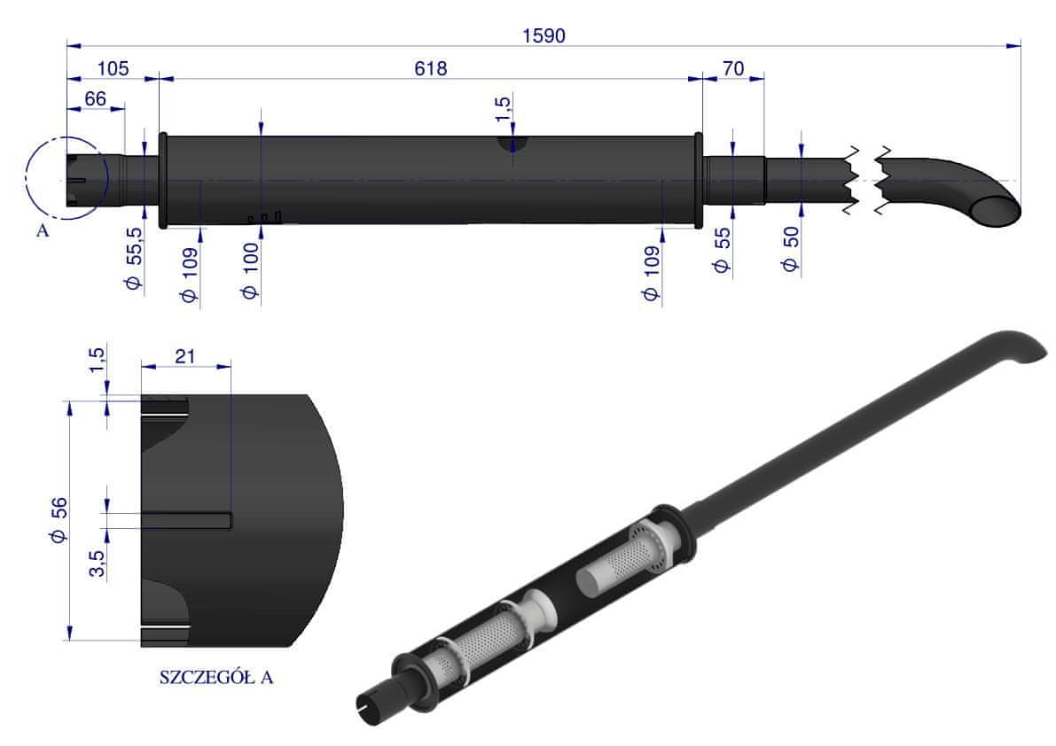 *Ukrivljena konica usmerja izpušne pline vstran, kar preprečuje vstop izpušnih plinov v voznikovo kabino. *Aluminizirana pločevina DX53 + 120AS, odporna proti koroziji. *Barva na osnovi smole, modificirana s silikonom, odporna na temperature do 900°C. * Trajna, vidna oznaka.OPOMBA!    Barvo, uporabljeno na dušilcih, je treba segreti, da postane enotna. Po namestitvi na traktor in ogrevanju dušilca ​​bodo manjše praske in odrgnine izginile.