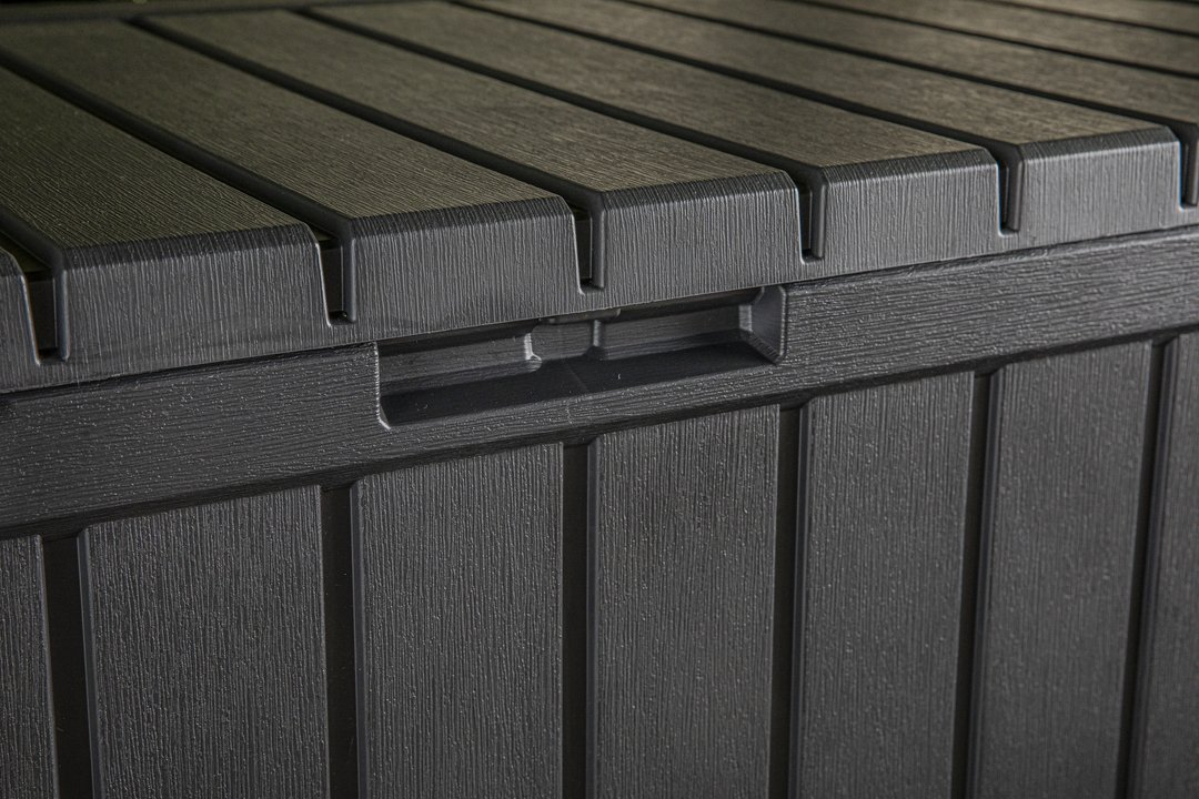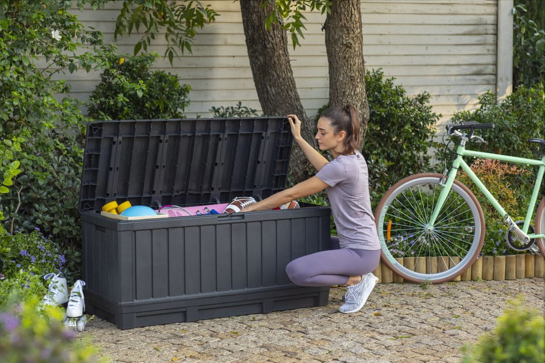 Keter Kentwood Storage Box 350L ima dvojni namen: lahko je dodatni sedež in hkrati zaboj za shranjevanje. Močan in trden pokrov zagotavlja največjo moč in stabilnost, zaradi česar je udoben in varen sedež za 2 osebi.
