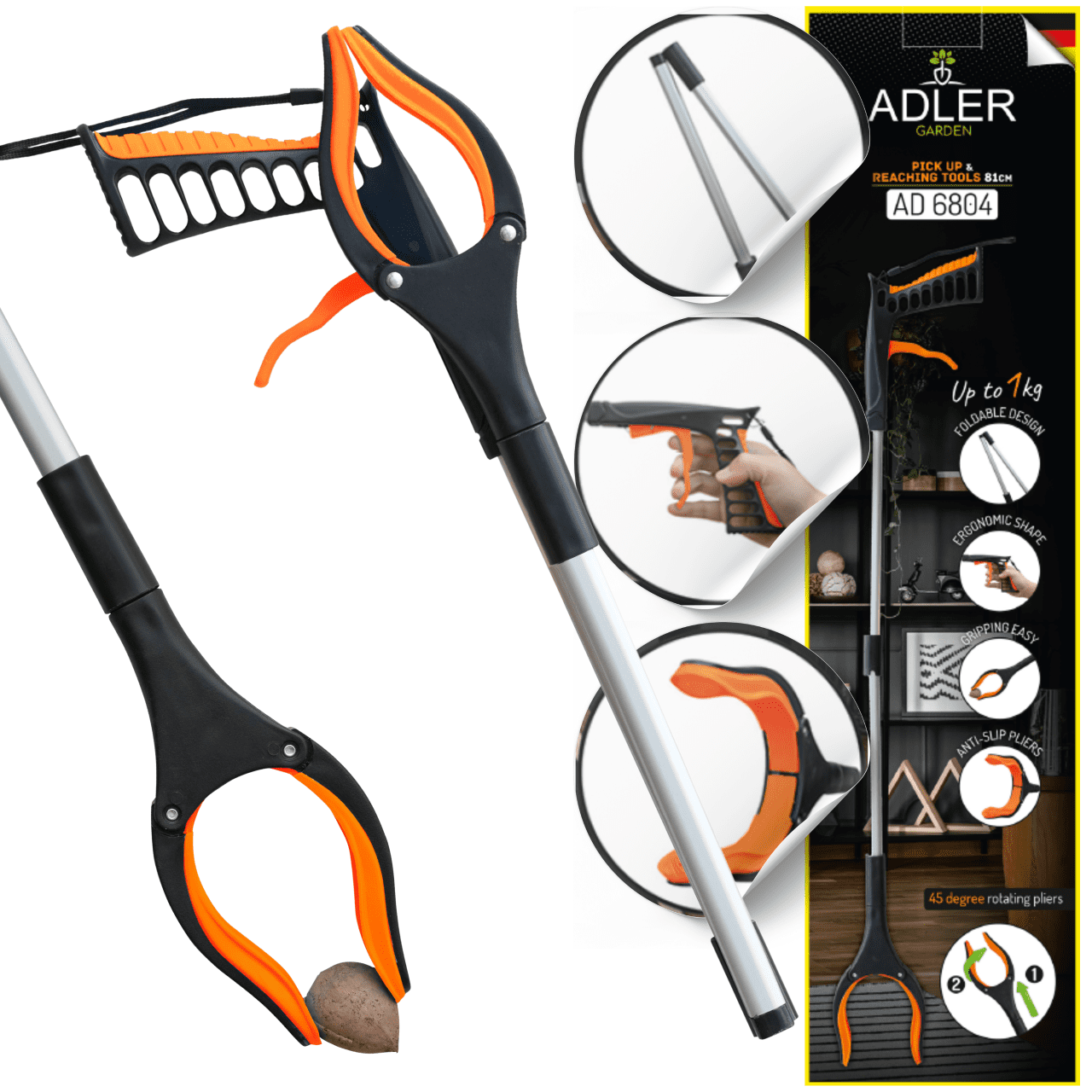 Večnamensko prijemalo – nenadomestljiv pomočnik doma in na prostem! Največja obremenitev: 1 kg Skupna dolžina: 81 cm Teža: 206 g Material: aluminij, PP plastika, TPR guma Barva: oranžna-črna-srebrna Večfunkcijsko prijemalo je praktično orodje, ki olajša vsakdanje življenje, saj vam omogoča dvigovanje lahkih predmetov, ne da bi se morali sklanjati. Popoln za doseganje težko dostopnih predmetov, kot so listje, smeti, otroške igrače, TV daljinci, časopisi, kot tudi za zapiranje zaves ali draperij. Naprava se odlično obnese tudi v ozkih prostorih, na primer za pralnim strojem in kot pripomoček za čiščenje težje dostopnih mest. Mere izdelka in vsebina seta: Skupna dolžina: 81 cm Mere po zlaganju: 43 × 14 × 5 cm Teža: 206 g Komplet vsebuje: prijemalo, tekstilni zapestni trak Maksimalna obremenitev: 1 kg Omogoča dvigovanje lahkih predmetov brez napora, kot so TV daljinci, knjige, časopisi, plastenke za vodo, itd. Dolžina: 81 cm Omogoča doseganje predmetov na težko dostopnih mestih, npr kot police na vrhu garderobne omare, prostori za pohištvom ali zavesami. Dolžina v zloženem stanju: 43 × 14 × 5 cm Zložljiva zasnova omogoča enostavno shranjevanje prijemala in zavzame minimalen prostor. Material: aluminij, PP plastika, TPR guma Visokokakovosten aluminij zagotavlja vzdržljivost in odpornost proti koroziji, medtem ko PP plastika in TPR guma zagotavljata lahkotnost in čvrst oprijem. Teža: 206 g Lahka zasnova omogoča enostavno prenašanje in uporabo prijemala starejšim osebam ali osebam z omejeno telesno močjo. Ergonomski ročaj: zasnovan za udoben oprijem in minimalno utrujenost rok med dolgotrajno uporabo. 45-stopinjsko vrtenje klešč: Ta funkcija vam omogoča natančen prijem predmetov pod različnimi koti, kar je še posebej uporabno na ozkih in težko dostopnih mestih. Tekstilni zapestni trak: Preprečuje padec prijemala iz roke in omogoča lažje obešanje, kar poveča udobje in varnost. Gumirane klešče: oblikovana guma na kleščah zagotavlja čvrst oprijem predmetov brez nevarnosti, da bi jih opraskali, kar je idealno za občutljive ali spolzke predmete. 1,0 mm debela eliptična kvadratna cev iz aluminijeve zlitine: poveča trdnost in odpornost proti poškodbam, kar ima za posledico daljšo življenjsko dobo orodja. Namen: Idealno za uporabo doma, na prostem in na delovnem mestu, kjer morate dvigovati in prenašati lahke predmete, ne da bi se morali skloniti. Pogosto zastavljena vprašanja (FAQ): V: Kakšna je največja teža, ki jo lahko dvignete s tem prijemalom? A: Prijemalo lahko dvigne predmete, ki tehtajo do 1 kg. V: Ali je prijemalo primerno za uporabo na prostem? O: Da, prijemalo se lahko uporablja v zaprtih prostorih in na prostem. V: Ali je prijemalo zložljivo? O: Da, prijemalo ima zložljivo zasnovo, kar olajša shranjevanje. V: Kateri materiali so bili uporabljeni za izdelavo prijemala? A: Prijemalo je izdelano iz aluminija, PP plastike in TPR gume, kar zagotavlja njegovo vzdržljivost in lahkotnost. V: Ali lahko prijemalo uporabljajo starejši ljudje? A: Seveda! Prijemalo je lahko, enostavno za uporabo in ima ergonomski ročaj, zaradi česar je idealno za starejše in ljudi z omejeno telesno močjo. Primerjava z drugimi izdelki v tej kategoriji: V primerjavi z drugimi prijemali, ki so na voljo na trgu, naš izdelek izstopa po: Trdnosti: 1,0 mm debela eliptična kvadratna cev iz aluminijeve zlitine zagotavlja večjo odpornost proti koroziji in vzdržljivost. Ergonomija: Ergonomski ročaj in možnost vrtenja klešč za 45 stopinj olajšata uporabo. Lahek: s težo le 206 g je naš grabelnik enostaven za prenašanje in uporabo za starejše ali manjše ljudi. Praktičnost: Zložljiva zasnova in tekstilni zapestni trak zagotavljata udobje in varnost med uporabo. Naš predlog je idealen za vse, ki iščejo praktično in vzdržljivo orodje za vsakodnevno uporabo, ki bo olajšalo življenje doma in na prostem.