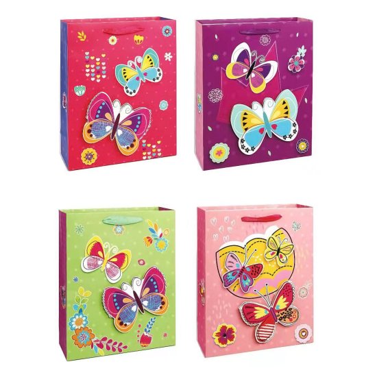 Darilna vrečka 3D. Vzorec: metulji. Dimenzije: 24 × 8 × 18 cm (vxšxš). Material: papir. Svilen ročaj. Sortiment: Izbirate lahko med 4 vzorci. Celoten opis