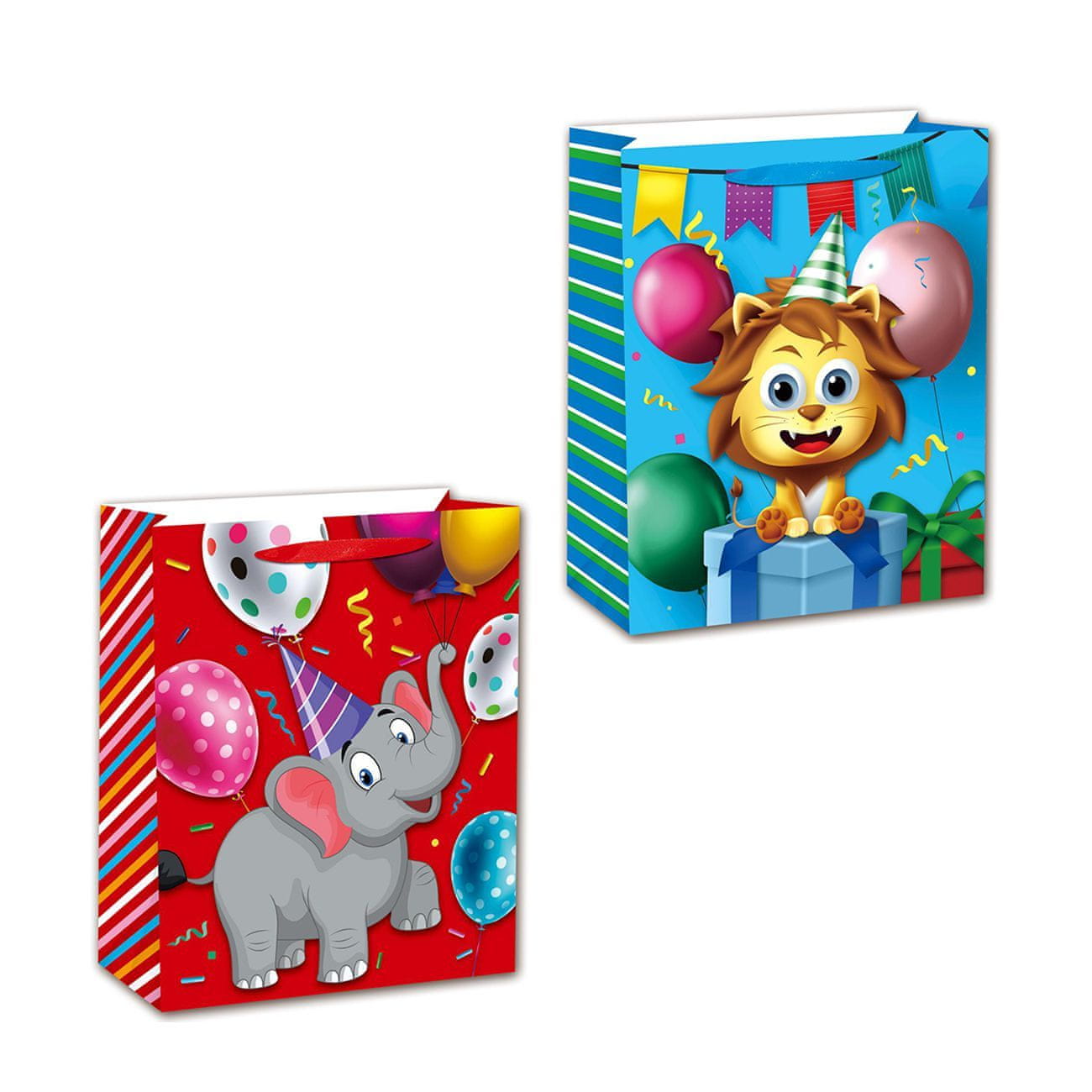 Darilna vrečka 3D. Vzorec: živalska zabava. Dimenzije: 40 × 12 × 30 cm (vxšxš). Material: papir. Svilen ročaj. Sorto: na izbiro so različni vzorci. Celoten opis