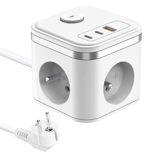Mrežni adapter – vozlišče – vtičnica – 3 x izhod AC (230 V) – 1 x USB-A (5V/3A) – 2 x USB-C (5V/3A) – priročen gumb za vklop/izklop – kompaktna velikost in oblika – 1,4 m dolg kabel – hkrati lahko polnite do 6 naprav