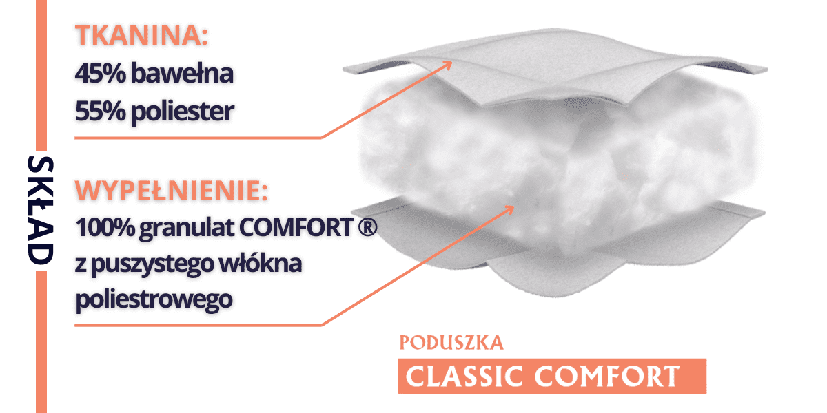 za večjo vzdržljivost in udobje. Prevleka vzglavnika CLASSIC je izdelana iz bombažne in poliestrske tkanine, poliestrskega polnila in netkane tkanine.
