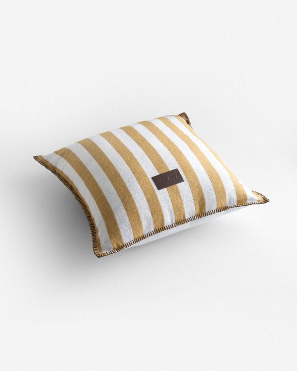 Vzglavnik Ambra letos pritegne pozornost s svojo trendovsko gorčično barvo, ki se popolnoma ujema s trenutnimi trendi notranje opreme. Črte v odtenkih gorčice in krem nežno razbijajo klasično obliko dizajna. Na sprednji strani je logotip iz naravnega rjavega usnja, ki doda pridih elegance in poveča privlačnost dizajna. Hrbtna stran vzglavnika je krem barve s kontrastnim logotipom La Mania. Blago z izrazitim, ravnim tkanjem iz mešanice bombaža in akrila je trpežno, mehko in udobno za vsakodnevno uporabo. Debeli, dekorativni šivi v temno rjavem odtenku okrasijo in dopolnijo videz. Priporočamo pranje pri 30 °C, brez uporabe agresivnih detergentov. Izdelano na Poljskem.