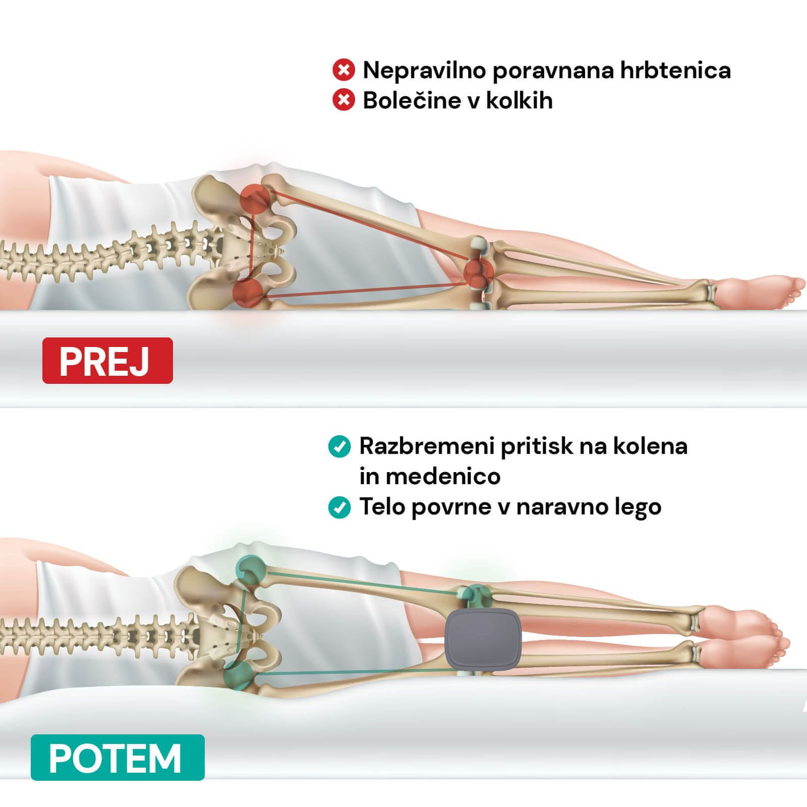 Blazina za kolena MemoSilver VitaSpine je odlična rešitev za ljudi, ki spijo na boku, in vse, ki želijo zmanjšati bolečine v kolkih, nogah in spodnjem delu hrbta. Zasnovana je tako, da se udobno prilega med kolena in omogoča naravno ravno lego hrbtenice med ležanjem. Obenem pomaga zmanjševati pritisk na sklepe in medenico, kar blaži bolečine med spanjem. S svojo ergonomsko obliko in optimalno podporo je tudi idealna rešitev za nosečnice in okrevanje po operaciji. Inovativna spominska pena MemoTouch se optimalno prilagodi telesu, da mu zagotovi potrebno podporo za udoben počitek. Prevleka je obogatena s srebrovimi ioni, ki pomagajo preprečevati razmnoževanje bakterij, kopičenje alergenov in draženje kože. Ker je prevleka snemljiva in pralna, zagotavlja čistejše in bolj zdravo okolje za spanje in počitek.