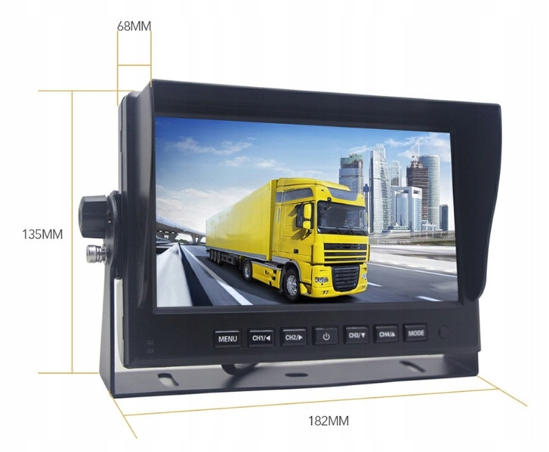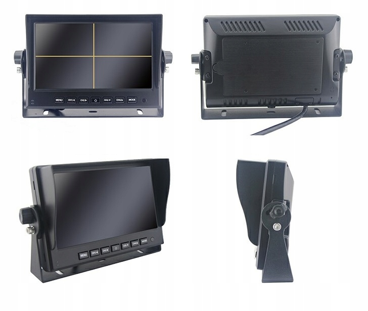 7-palčni AHD LCD monitor s funkcijo snemanja DVR Za težka dela za katerega so značilne povečana odpornost na vibracije in udarce, kovinski nosilec, ki zagotavlja stabilno namestitev, in senčnik.