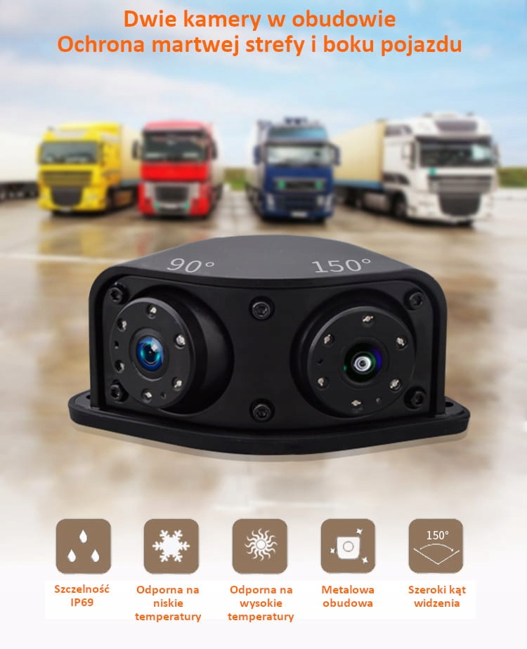 Stranska kamera z 90-stopinjskim kotom gledanja in 150-stopinjsko širokokotno kamero za mrtvi kot.