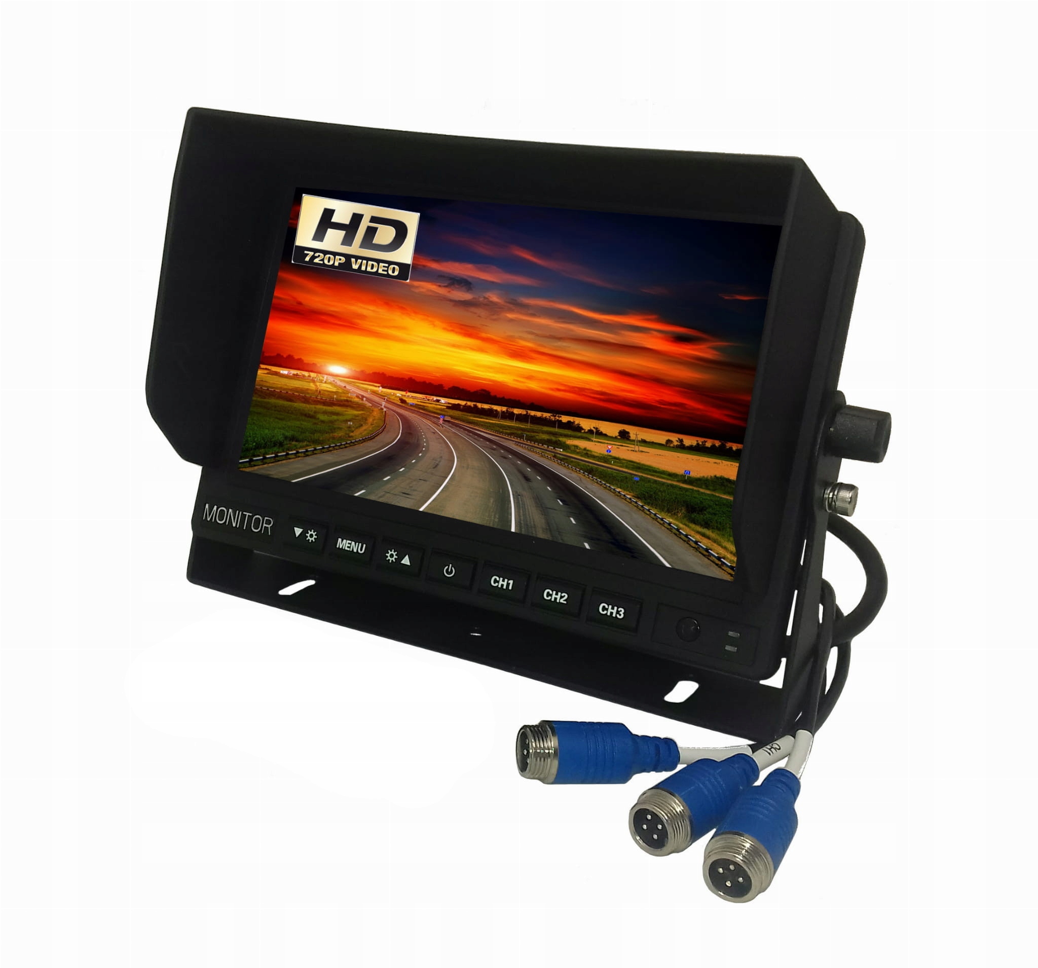 Visokokakovosten monitor (_ MOČNA serija z ojačano odpornostjo) z AHD 1042 × 600 matriko, ki podpira do 3 kamere v IP tehnologiji 720P@25/30, 720P@50/60, 1080P@25/30 . Ročno (z daljinskim upravljalnikom ali tipkami na dotik na ohišju) ali samodejno preklapljanje kamere po oddaji signala na krmilne kable. Senčnik zagotavlja dober vid v neugodnih svetlobnih pogojih v kabini.