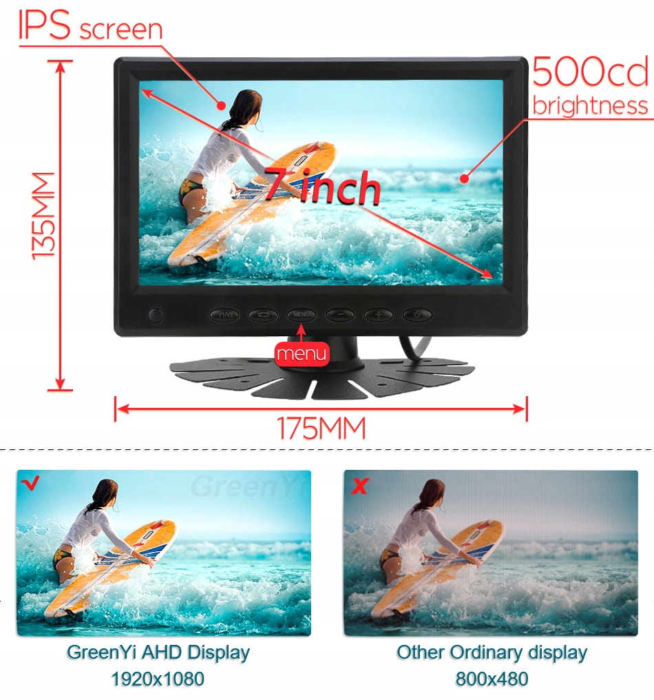 7-palčni barvni monitor za AHD kamere za vzvratno vožnjo. Znamka IPS matrika z visoko HD ločljivostjo 1024 x RGB x 600.