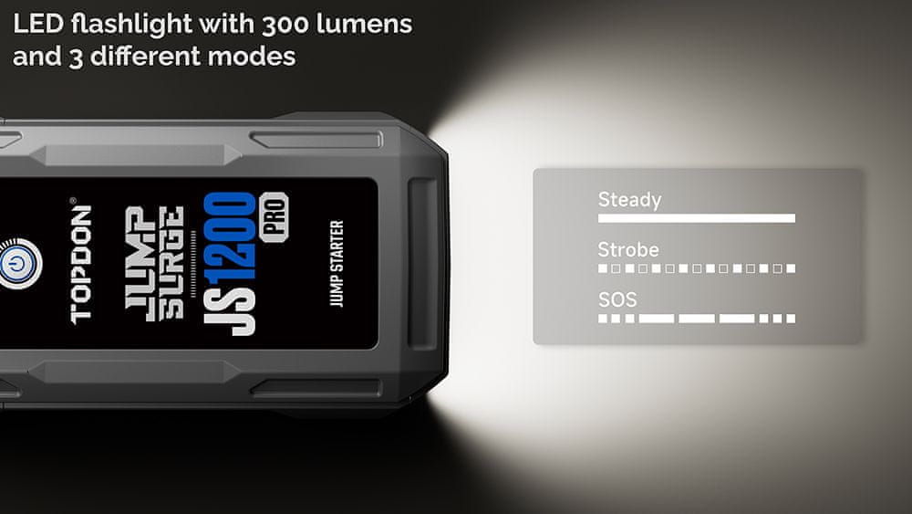 Tehnične specifikacije: TOPDON Model: JumpSurge 1200 PRO Zmogljivost: 3,7 V , 10000 mAh/37 Wh Vrsta baterije: Li-ion Izhod USB-A (2×): 5V/3A (15W) Vhod/izhod USB-C: PD18W, 5V/3A 15W, 9V/2A (18W) Izhod DC Jack: 16,8 V/10 A (168 W) Dimenzije: 8,5 × 17,5 × 3 cm Teža: 750 g Največji izhodni tok za vozila: 1800 A Svetloba LED: stalna, stroboskopska, SOS luč Delovna temperatura: od –10 °C do 40 °C Temperatura shranjevanja: od –20 °C do 75 °C Zaščita: IP64
