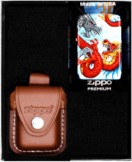 ZIPPO® komplet: Originalni vžigalnik ZIPPO in rjav usnjen etui ZIPPO s sponko v darilni škatli. Originalni bencinski vžigalnik ZIPPO® Windproof. Sistem WINDPROOF zagotavlja zanesljivost v močnem vetru. Vžig s kresilnim kamnom zagotavlja zanesljivo iskro v vseh pogojih. Zamenljivi kresilni kamni, stenj in vata omogočajo dolgoletno uporabo. Medeninasta konstrukcija zagotavlja odpornost proti koroziji in potrjuje izvirnost izdelka. Oblika kot na fotografiji in v naslovu. Pakirano v elegantni darilni škatli Zippo®.
