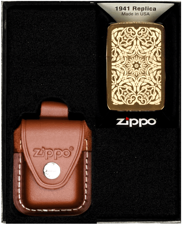 ZIPPO® komplet: Originalni vžigalnik ZIPPO in rjav usnjen etui ZIPPO z zanko za pas v darilni škatli. Originalni bencinski vžigalnik ZIPPO® Windproof. Sistem WINDPROOF zagotavlja zanesljivost v močnem vetru. Vžig s kresilnim kamnom zagotavlja zanesljivo iskro v vseh pogojih. Zamenljivi kresilni kamni, stenj in vata omogočajo dolgoletno uporabo. Medeninasta konstrukcija zagotavlja odpornost proti koroziji in potrjuje izvirnost izdelka. Oblika kot na fotografiji in v naslovu. Pakirano v elegantni darilni škatli Zippo®.