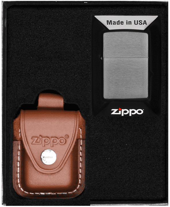 ZIPPO® komplet: Originalni vžigalnik ZIPPO in rjav usnjen etui ZIPPO s sponko v darilni škatli. Originalni bencinski vžigalnik ZIPPO® Windproof. Sistem WINDPROOF zagotavlja zanesljivost v močnem vetru. Vžig s kresilnim kamnom zagotavlja zanesljivo iskro v vseh pogojih. Zamenljivi kresilni kamni, stenj in vata omogočajo dolgoletno uporabo. Medeninasta konstrukcija zagotavlja odpornost proti koroziji in potrjuje izvirnost izdelka. Oblika kot na fotografiji in v naslovu. Pakirano v elegantni darilni škatli Zippo®.