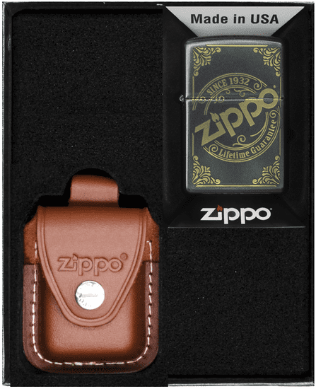 ZIPPO® komplet: Originalni vžigalnik ZIPPO in rjav usnjen etui ZIPPO s sponko v darilni škatli. Originalni bencinski vžigalnik ZIPPO® Windproof. Sistem WINDPROOF zagotavlja zanesljivost v močnem vetru. Vžig s kresilnim kamnom zagotavlja zanesljivo iskro v vseh pogojih. Zamenljivi kresilni kamni, stenj in vata omogočajo dolgoletno uporabo. Medeninasta konstrukcija zagotavlja odpornost proti koroziji in potrjuje izvirnost izdelka. Oblika kot na fotografiji in v naslovu. Pakirano v elegantni darilni škatli Zippo®.