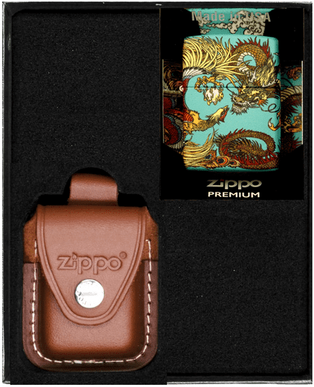 ZIPPO® komplet: Originalni vžigalnik ZIPPO in rjav usnjen etui ZIPPO z zanko za pas v darilni škatli. Originalni bencinski vžigalnik ZIPPO® Windproof. Sistem WINDPROOF zagotavlja zanesljivost v močnem vetru. Vžig s kresilnim kamnom zagotavlja zanesljivo iskro v vseh pogojih. Zamenljivi kresilni kamni, stenj in vata omogočajo dolgoletno uporabo. Medeninasta konstrukcija zagotavlja odpornost proti koroziji in potrjuje izvirnost izdelka. Oblika kot na fotografiji in v naslovu. Pakirano v elegantni darilni škatli Zippo®.