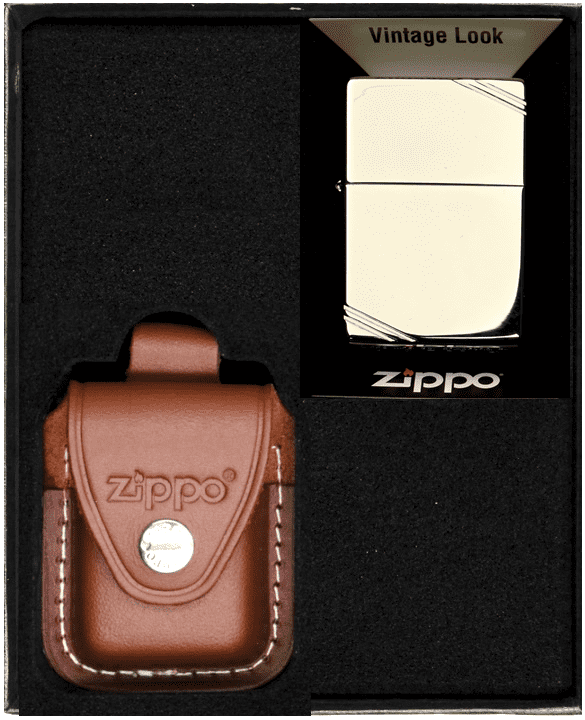 ZIPPO® komplet: Originalni vžigalnik ZIPPO in rjav usnjen etui ZIPPO z zanko za pas v darilni škatli. Originalni bencinski vžigalnik ZIPPO® Windproof. Sistem WINDPROOF zagotavlja zanesljivost v močnem vetru. Vžig s kresilnim kamnom zagotavlja zanesljivo iskro v vseh pogojih. Zamenljivi kresilni kamni, stenj in vata omogočajo dolgoletno uporabo. Medeninasta konstrukcija zagotavlja odpornost proti koroziji in potrjuje izvirnost izdelka. Oblika kot na fotografiji in v naslovu. Pakirano v elegantni darilni škatli Zippo®.