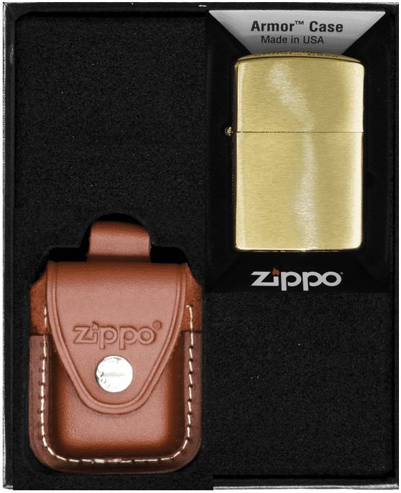 ZIPPO® komplet: Originalni vžigalnik ZIPPO in rjav usnjen etui ZIPPO s sponko v darilni škatli. Originalni bencinski vžigalnik ZIPPO® Windproof. Sistem WINDPROOF zagotavlja zanesljivost v močnem vetru. Vžig s kresilnim kamnom zagotavlja zanesljivo iskro v vseh pogojih. Zamenljivi kresilni kamni, stenj in vata omogočajo dolgoletno uporabo. Medeninasta konstrukcija zagotavlja odpornost proti koroziji in potrjuje izvirnost izdelka. Oblika kot na fotografiji in v naslovu. Pakirano v elegantni darilni škatli Zippo®.