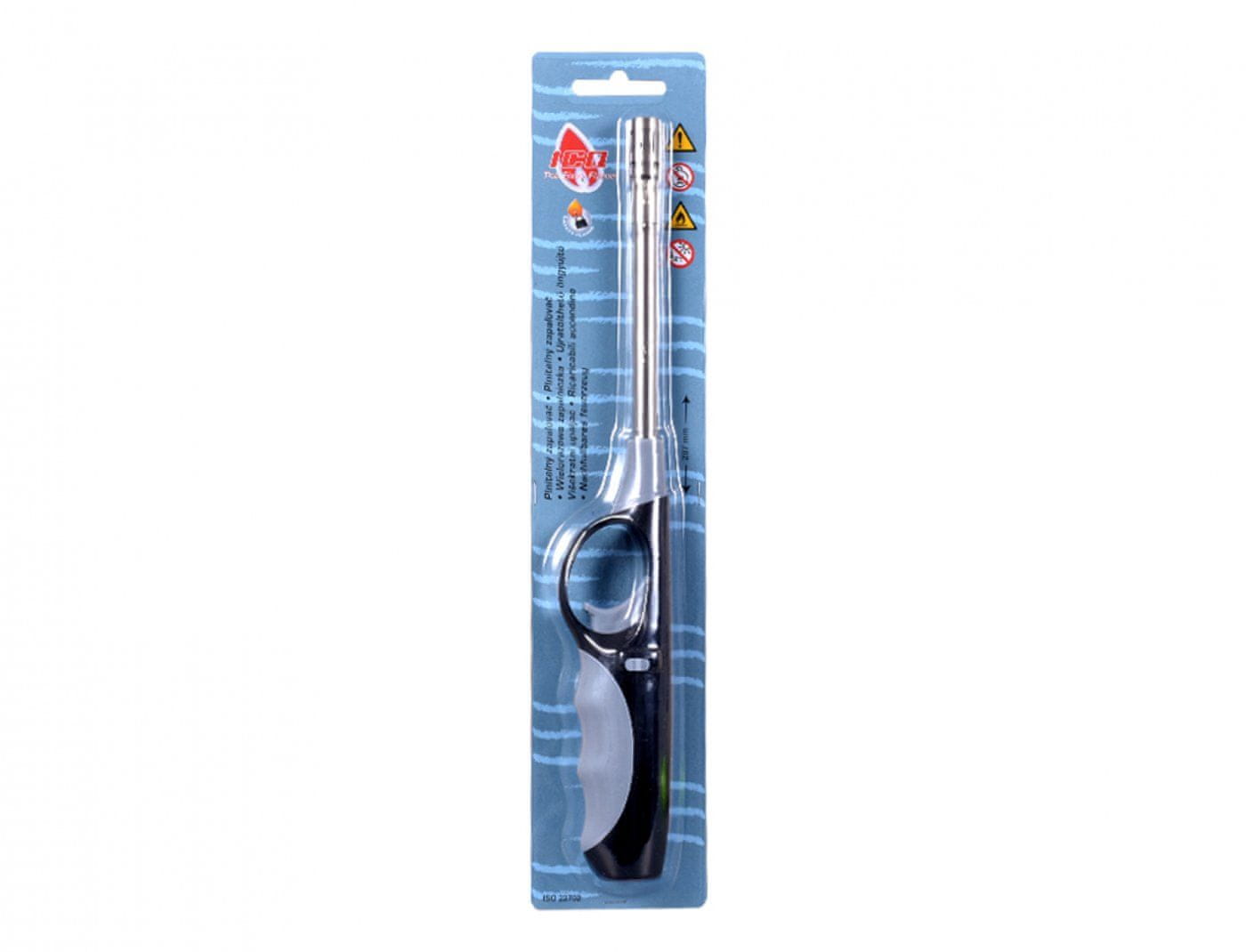 Gospodinjski plinski vžigalnik s piezoelektrično iskro in otroško varnostjo. Celoten opis