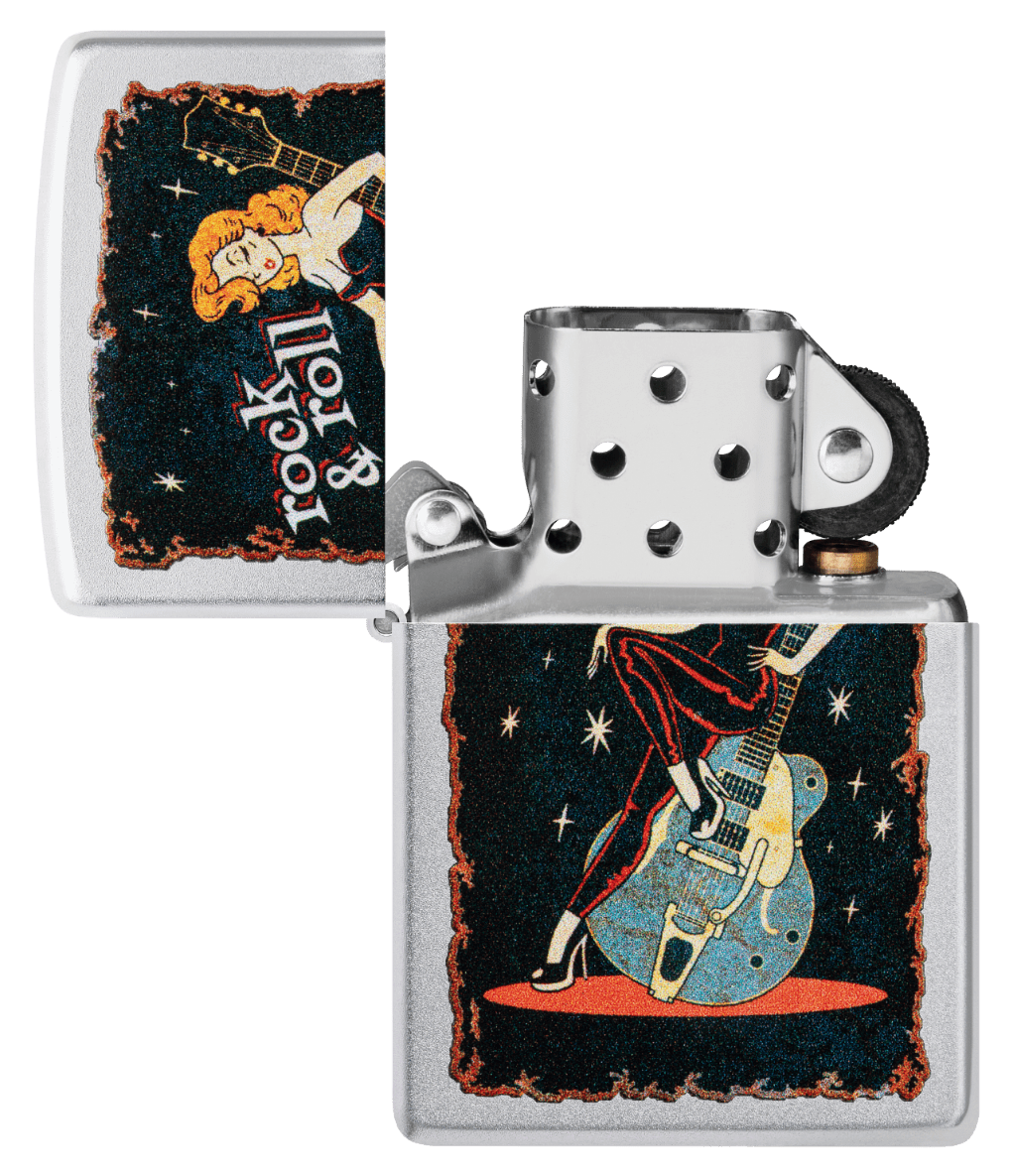 Material: Satin Chrome, Motiv: poslikava Rock'n'Roll dama na kitari. Poleg enostavne uporabe je lahko tudi vzdrževanje, saj ga lahko vzdržujemo sami. Zamenjamo lahko kresilni kamen, stenj in notranji bombaž/filc.Polnite ga z Zippo premium bencinom.