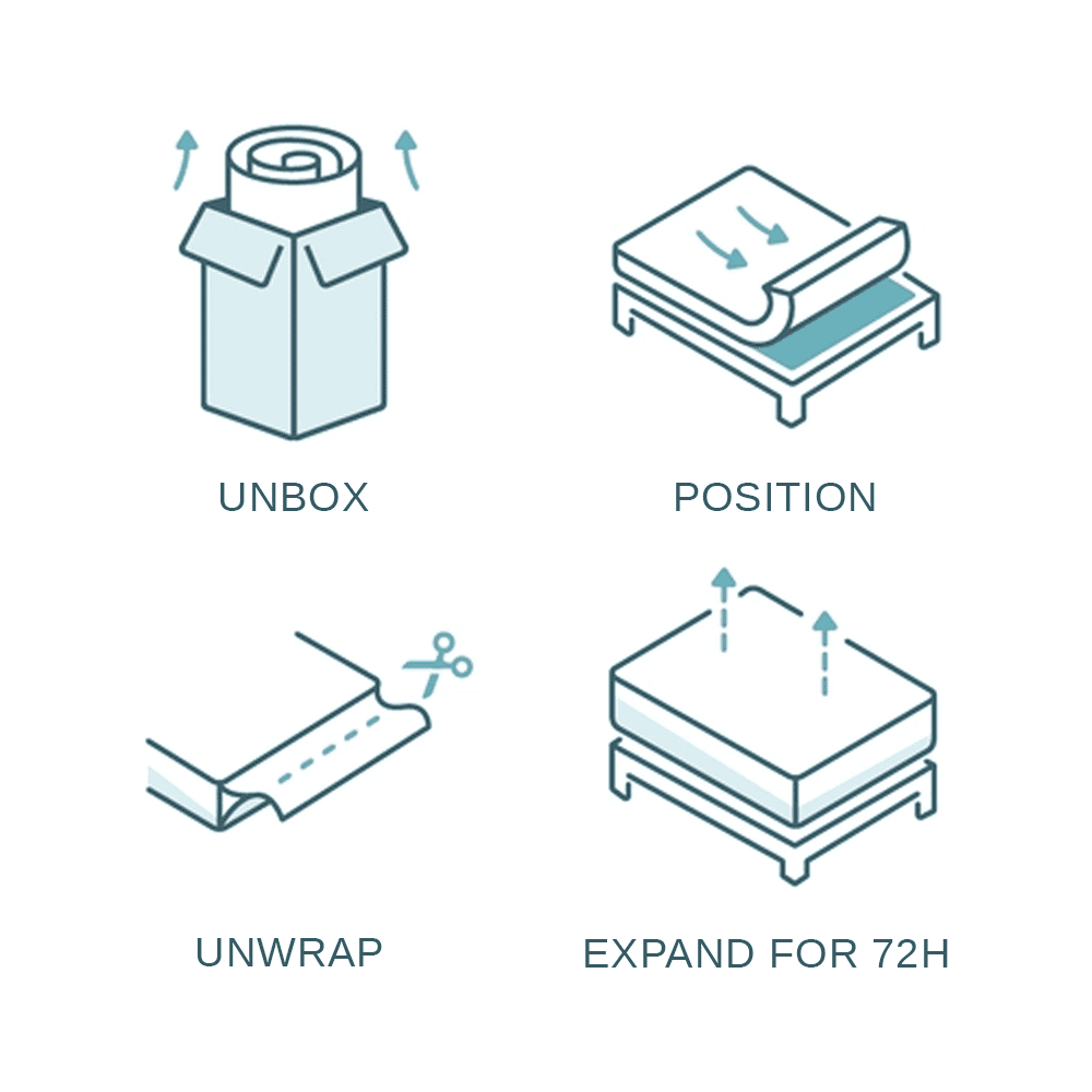 - Ležišče lahko začnete uporabljati, ko povrne svojo obliko in pravilne dimenzije (najkasneje v 72 urah). Priporočljivo je, da se hermetično zapakirano ležišče odpre čim prej po dostavi.