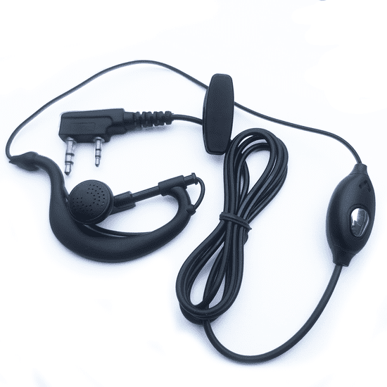 Slušalke za radijske postaje Quansheng s Kenwood priključkom 2,5 in 3,5 mm. Imajo sponko za pripenjanje na ovratnik. Slušalka se namesti za uho. Mikrofon s tipko nadomešča funkcijo PTT tipke na radijski postaji – pritisnete in govorite. Dolžina približno 105 cm.