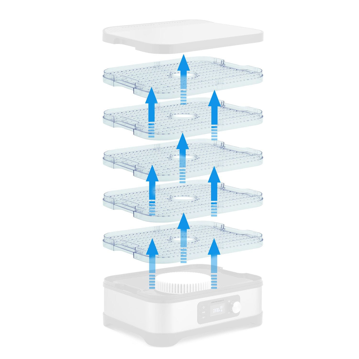 Takojšnje čiščenje in enostavna uporaba. Po sušenju dehidrator enostavno ločite na 5 ločenih pladnjev – preprosto jih sperite pod tekočo vodo! Pladnji so zasnovani tako, da se med sušenjem ne lepijo.
