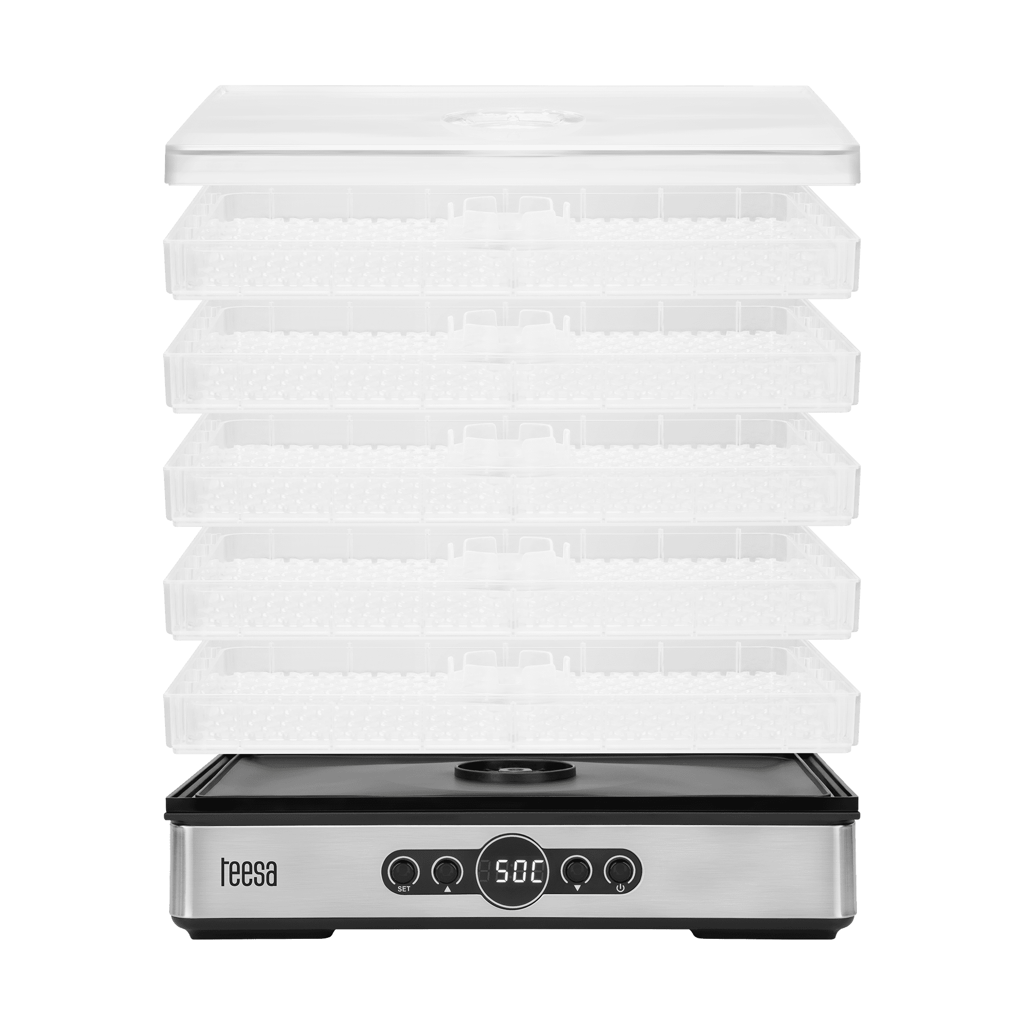 Dehidrator Teesa ponuja 5 velikih, prozornih pladnjev, ki lahko sprejmejo do 1,7 kg sadja in zelenjave. Prozorni pladnji vam omogočajo spremljanje postopka sušenja, ne da bi morali odpreti napravo, kar zagotavlja konstantno temperaturo in učinkovitost.